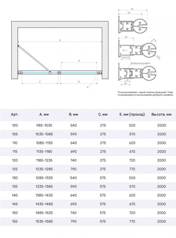 Дверь в душевой проём EP-F-1 NOVO h2000 135 07 01 правая профиль матовый хром стекло прозрачное Vegas Glass