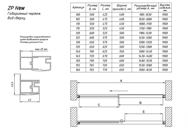 Дверь в душевой проем ZP NOVO 150 02М 01 проф черн мат стекло прозр (высота 1900мм) рег-ка 148-153 Vegas Glass