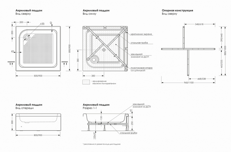 Акриловый душевой поддон квадрат«Universal S» 900х900 (h=300 мм, d слив.отверстия = 50 мм,сварная рама, съемный декор.экран) без сифона