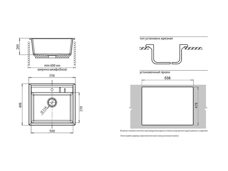 В связи с особенностями литьевого производства размеры изделий могут варьироваться, поэтому вырез в столешнице рекомендуется делать непосредственно с изделия.