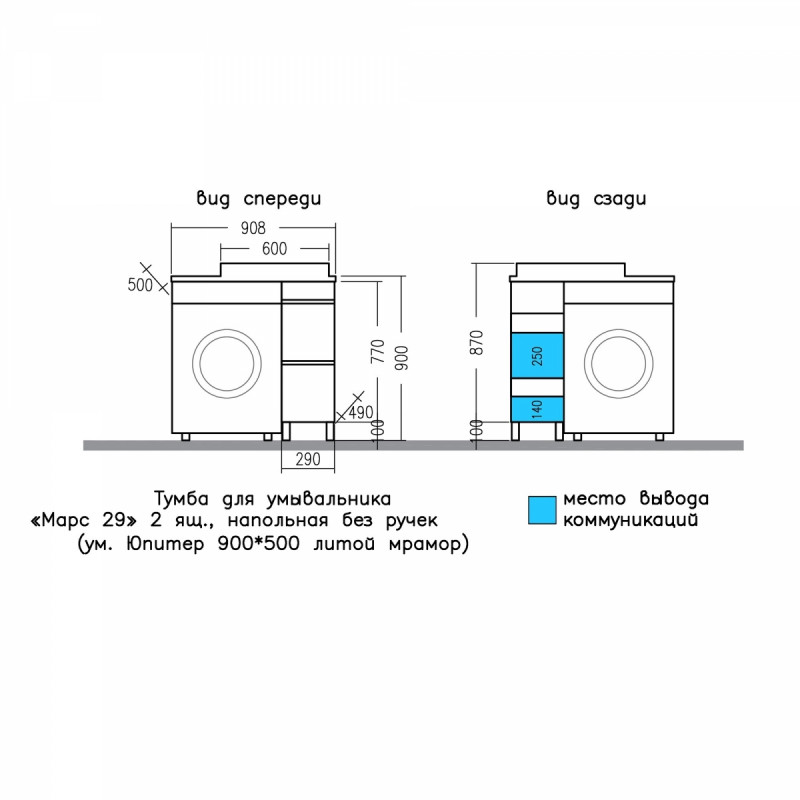 Тумба под умывальник над стиральной машиной напольная "Марс 29" 2 ящ. (ум.Юпитер 900*500лит.мр)НП САНТА