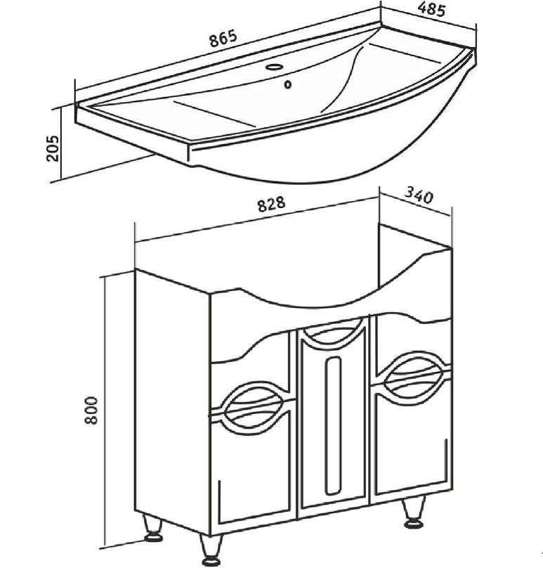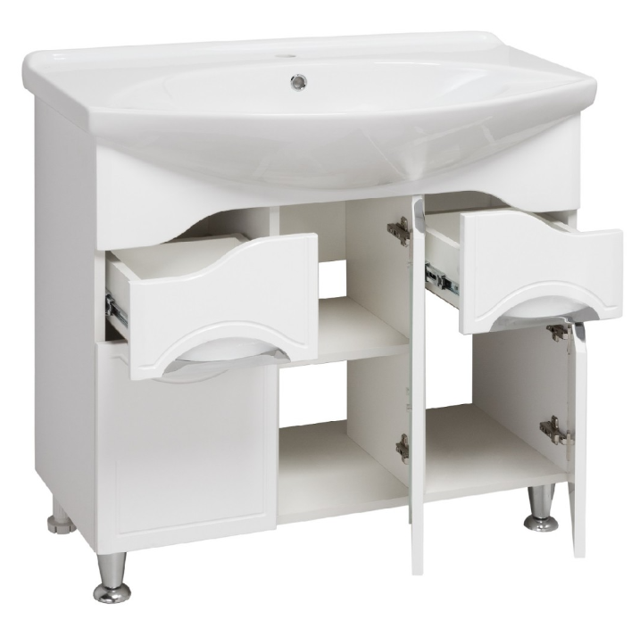 Тумба под раковину Runo Толедо 85 с распашными фасадами и двумя боковыми выдвижными ящиками. За центральным фасадом со стеклянной вставкой - одна внутренняя полка. Петли со встроенным доводчиком, ящики на шариковых направляющих полного выдвижения.