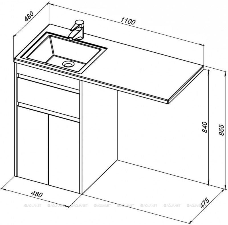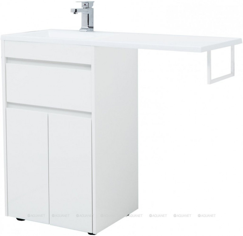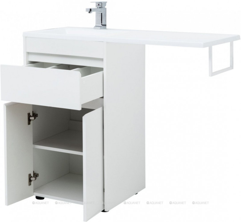 Тумба с раковиной Aquanet Токио 110 (напольная, 1 ящик, 2 дверцы) белого цвета представляет новый формат тумб производства Aquanet. Раковина из литьевого мрамора имеет длинную платформу,которая выходит далеко за пределы тумбы. Она предназначена для того,чтобы установить с правой стороны от тумбы стиральную машину. Платформа имеет такую длину,которая позволит спрятать под нее машинку средних размеров с фронтальной загрузкой. Корпус тумбы выполнен из влагостойкого ДСП,а фасады – из МДФ с покрытием эмалью. Разнообразные зоны хранения в тумбе шириной 480 мм скрыты в ящике и за распашными дверками. Тумбу можно использовать и без соседства со стиральной машиной,а свободное пространство под платформой раковины занять подкатной тумбой,приспособлениями для уборки помещения или столиком